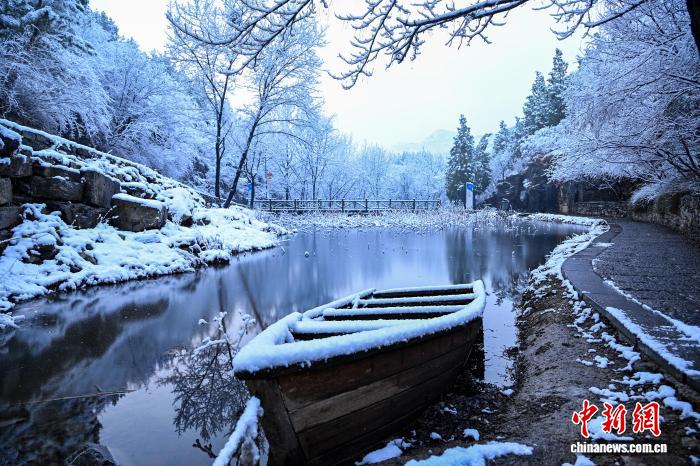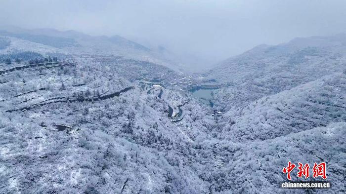 今日淄专潭溪山迎秋雪,玉树琼枝取葱翠潭火相应,好若火朱绘。(无人机像片)李沅昊 摄